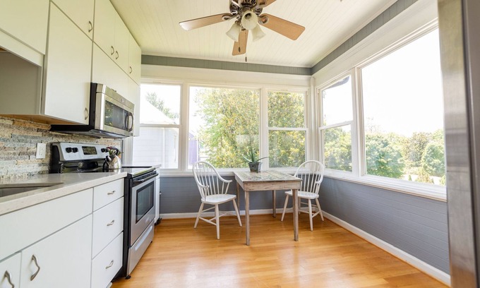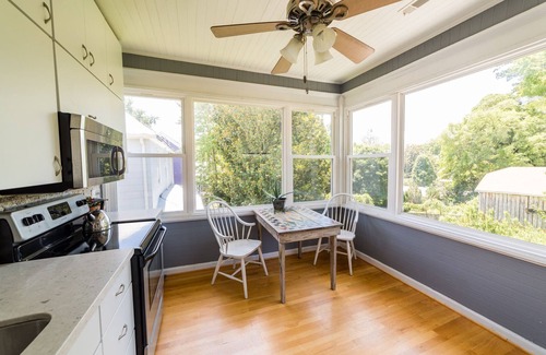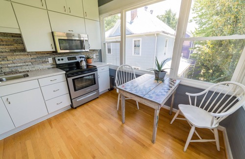 The space itself is clean, bright and airy. The kitchen may be the crown jewel of the apartment, with half of it encased in glass, allowing for lots of light and pretty views as you enjoy your morning coffee or evening wine. It has white quartz countertops, stainless steel appliances (including a dishwasher and garbage disposal) and a reclaimed granite backsplash. We've got it stocked with coffee, tea, a bit of breakfast and your kitchen essentials. Hardwood floors are throughout the apartment, minus the bathroom, which is tiled.