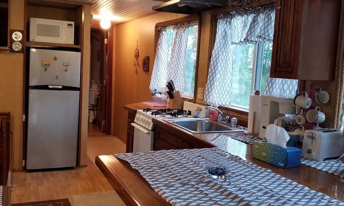 Anchors Away (Houseboat) located on the Seneca/Cayuga Canal, a great place to have families get together make memories to last a life time. This accommodations has 2 private bedrooms with memory foam beds (1 Double bed and 1 Queen bed). Linens and Towels are not included. There are pillows and comforters provided. Full working and well supplied Kitchen with everything you will need to prepare meals for your family. Swimming in the clear, serene Canal.