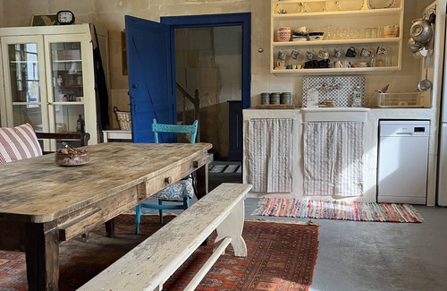 Belle charentaise du 18e siècleau bord de l’eau, pour10 personnes. Le cadre est très charmant et bucolique, la maison est entourée de verdure, sur 7000 m2 de jardin et de champs. Très calme donc, cette grande maison offre beaucoup d’espace à vivre, une grande cuisine/ salle à manger, un grand salon avec bibliothèque bien fournie, un bureau. Deux escaliers distincts desservent l’étage: d’un côté, il y a 3 chambres doubles et deux salles de bain dont une”ensuite, de l’autre côté de la maison, deux chambres dont une grande avec petit lit d’enfant/ petit canapé, une salle de bain complète et une buanderie. Très confortable tout en gardant son âme rustique. Près de Jonzac, de Cognac et à environ1/2 heure des belles plages de l’embouchure de la Gironde, 1h de Royan et de la côte sauvage, et aussi1h de Bordeaux en train! Dans le village situé à2km il y a un café/épicerie/ restaurant, et une superbe piscine municipale d’été. À Jonzac, tous les commerces et restaurants, ainsi que les Thermes et les fameuses Antilles de Jonzac.