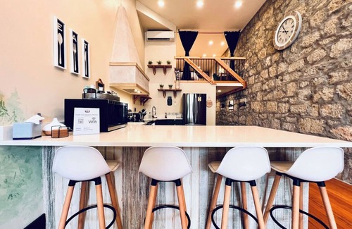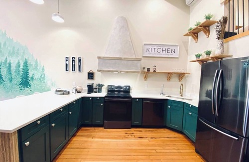Stay at Aneroid, a luxurious condo in the historic Litch Hotel, combining modern comforts with vintage charm. Enjoy soaring 15ft ceilings, hardwood floors, stone walls, quartz countertops, and handcrafted Olaf dishware. The bathroom includes a makeup station for added convenience. Main floor: king bed; mezzanine: king bed. Pet-friendly!