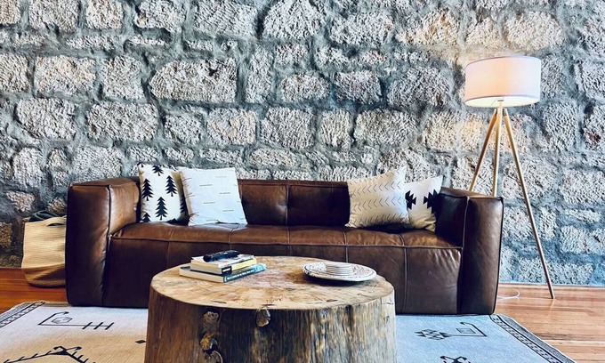 Enjoy a cozy meal at the small dining table by the front window, using locally handcrafted plates, bowls, and coffee cups. The kitchen flows seamlessly into the living room, where a leather sofa beckons you to unwind in front of a large HD Smart TV—your home away from home!