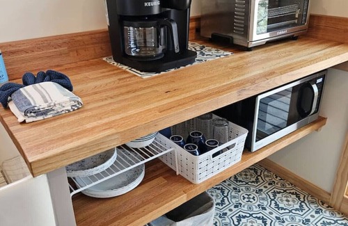 KITCHENETTE: Fridge, hot plate, microwave, toaster oven, cooking basics, spices, coffee maker, slow cooker, toaster, dishware/flatware, paper towels/trash bags