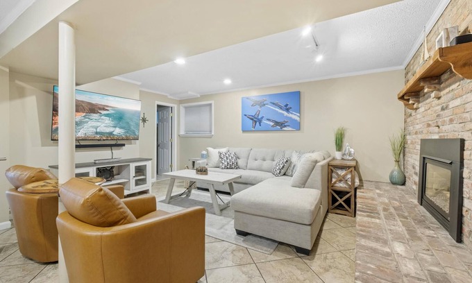 Descend into the lower living area, where the allure of a gas fireplace awaits. Featuring a 65-inch smart tv, large couch and lounge space, dry bar complete with a beverage fridge and high-top table - it is the ultimate space for laughter, games, and creating unforgettable memories. Watch tv/movies, listen to music, play any of the fun games provided, or use the large chalkboard to invent your own games, there is no lack of entertainment to be had in this space.