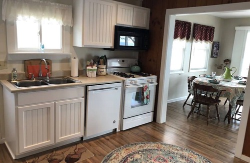 This is a delightful modern year around lake front cottage - recently updated and redecorated. Large modern kitchen and bath with walk-in shower. Two spacious bedrooms each with queen beds. Large living room with dining area and great lake views through two sliding glass doors to the full width deck overlooking lake. There is a new queen sofa bed in living room, along with new large smart screen TV. Cable programming and high speed wireless internet. Very nice hot tub. Outdoor charcoal grill and fire pit. Very nice yard and beach frontage, along with dock. Delightfully decorated. Well maintained and exceptionally clean. Kayaks and bikes available to rent for $25/day/item - delivered to cottage.