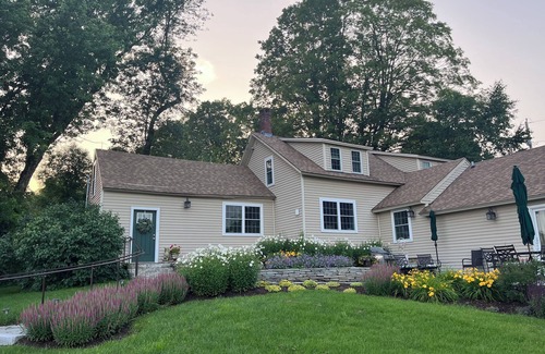 Located in West Windsor, this charming farmhouse, built in 1842 with some of the original floors, offers 4 spacious bedrooms - 2 with king beds and 2 with queen beds. Amenities include: WiFi, a fully stocked, spacious kitchen with granite countertops and quality cookware; laundry room with full-size w/d, soaking sink, and hanging rack; two bathrooms with tile showers, fluffy towels, sulfate-free products, and hair dryers.