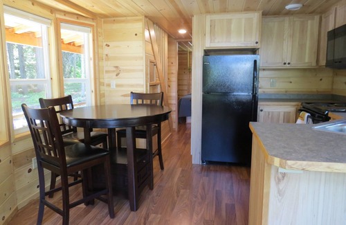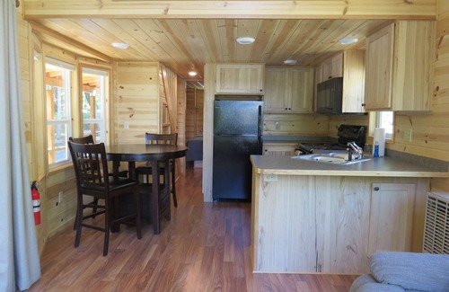 This cabin features a full length side porch and entrances with great privacy. Located just 50' from Antone Creek, this cabin location is the most private of all. Features an electric range, propane and electric heat, full kitchen plus a laundry ctr. Enjoy the creek out your front and a clean cozy cabin inside.