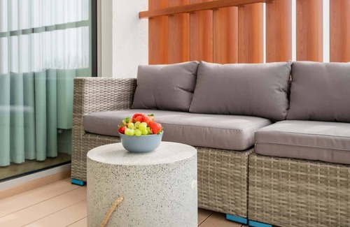 The apartment is located on the 5th floor, which is easily accessible by the lift that is available in the building. The apartment can accommodate 3 people, making it a great option for both couples and small families. The apartment space offers a living room with a double bed and a sofa bed, a kitchenette, and a bathroom with a shower. The balcony, with comfortable garden furniture, will be a great place to relax. The apartment is distinguished by its modern design, aesthetics and functionality. The living area equipped with a double bed (which can be separated into two single beds), a sofa bed and a TV is a perfect place for rest and relaxation, additionally a fully equipped kitchenette allows you to prepare your favourite meals. The pleasant design and comprehensive provision of necessary kitchen and bathroom accessories guarantee a comfortable stay. Parents travelling with a baby can also order a cot and highchair for their child.