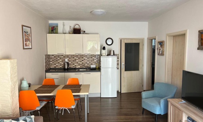 Apartmán Kykula - Terchová, Vyšné Kamence 1520 is located in Terchová, just 24 miles from Orava Castle and 15 miles from Budatin Castle. Housed in a building dating from 2010, this apartment provides free Wifi and free private parking. Lietava Castle is 20 miles from the apartment and Likava Castle is 28 miles away. Providing a balcony and mountain views, the apartment includes 2 bedrooms, a living room, satellite flat-screen TV, an equipped kitchen, and 1 bathroom with an a bath or shower. The accommodation is non-smoking. For guests with children, the apartment features a children's playground.