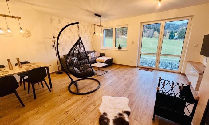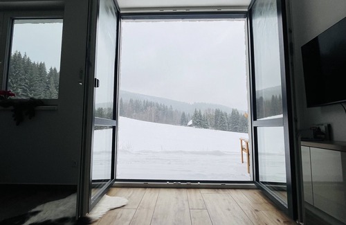 The apartment is situated in a beautiful, quiet countryside with a view of the Jizera Mountains valley directly from the living room or kitchen. We offer accommodation in our apartment for a family with children or friends with an area of 70 m2. In the apartment you will find 2 bedrooms for 4 persons, bathroom, wardrobe and of course a large living room with kitchen with fireplace. The apartment is equipped with all the necessary facilities and is designed for a maximum of 4 people.