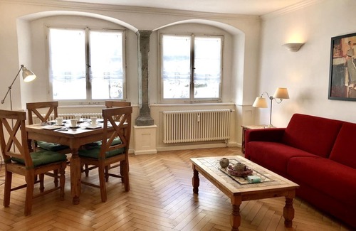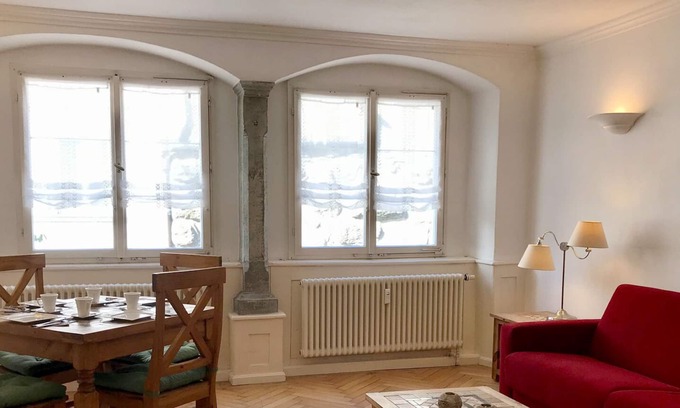 Charming in a historic building, central and only 100m to the lake A charming apartment with flair on the 2nd Upper floor with 55 square meters in a historic building. The living room is very comfortably designed with a sofa bed, TV and dining area. The kitchen is well equipped with a ceramic hob, oven, dishwasher, coffee machine, kettle and plenty of dishes.