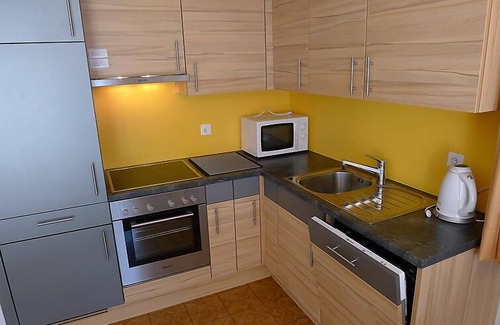 3-room apartment 65 m2, on the ground floor. Cosy furnishings: living/dining room with satellite TV, flat screen and radio. Exit to the garden, to the patio. 2 double bedrooms, each room with 2 beds and hand-basin. Open kitchen (oven, dishwasher, 4 ceramic glass hob hotplates, microwave). Shower/WC. Large patio. Barbecue, deck chairs. Very beautiful view of the mountains and the countryside. Facilities: baby cot. Internet (WiFi, free). Parking at the house. Please note: non-smokers only. Maximum 2 pets/ dogs allowed.