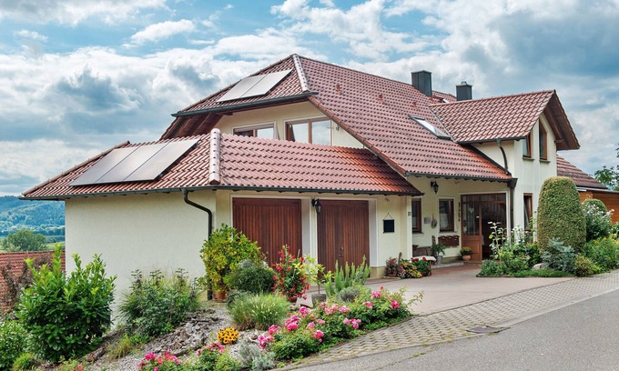 Our very beautiful 2.5-room holiday apartment with 70 sqm and the secluded open-view terrace (25 sqm) on the upper floor above the double garage is equipped with garden furniture and sun loungers. You can enjoy the unobstructed view of the blue Lake Constance, the green Bodanrück with its cozy, partly wooded hiking trails, as well as the western Lake Constance basin with its well-kept orchards and fresh fruits. Free parking spaces and bicycle storage are available at the house. Upon request, we offer a bread and roll delivery service from 7:00 am.