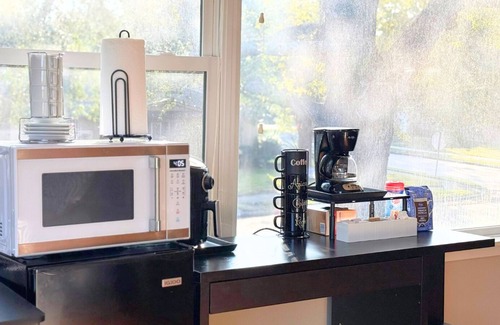 This is one huge! room with 3 walls of windows. You'll enjoy one full size bed, a twin size day bed, and a single size futon. It is comfortable for 4 people to sleep. You have your full bathroom and designated workspace. You will also have your "food area" which includes a mini fridge, coffee maker, microwave, and small airfryer.