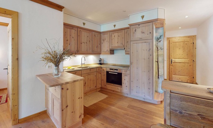 The apartment is designed in a chalet style with plenty of wood and furnished with selected materials and furniture.