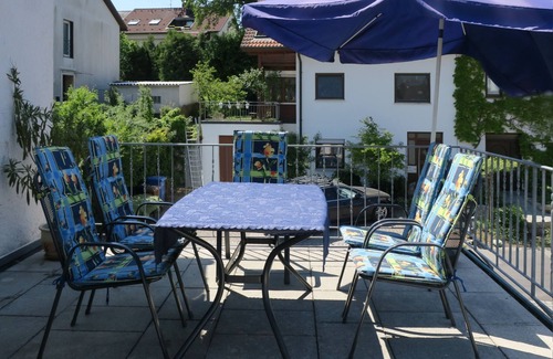 Our location in Constance-Dingelsdorf: Our two vacation homes in Constance-Dingelsdorf are located next to each other, just 100 m from the shores of Lake Constance. You can reach the landing stage (300 m), the town center and the free lido (400 m) in just a few minutes on foot. Dingelsdorf is 11 km from Constance and the train station, 24 km from Friedrichshafen Airport on Lake Constance and 70 km from Kloten Airport near Zurich. It is a preferred residential area of Constance with many gardens and nearby hills with orchards and forests. Our houses with 5 vacation apartments are particularly interesting for groups and friendly families. You live next to each other and yet have your own realm. The Lake Constance circular route (256 km) leads past the houses. Leisure activities: Fun and games in various parks, water sports, golf, horse riding, tennis, mountain hiking (the Alps are only 60 km away). Restaurants and grocery stores can be found in the village and neighboring towns. The only council north of the Alps took place in Constance from 1414 to 1418. Local sights: Baden-Württemberg Archaeological State Museum (ALM), municipal Rosgarten Museum, pile dwellings, Mainau flower island, Reichenau vegetable island, Rhine Falls (CH, 40 km), the 1,000-year-old Meersburg castle, Säntis (60 km, 2,500 m), the lake's local mountain and much more. Parking for bicycles and cars is available at the house. We provide WLAN free of charge. You can use the large garden with pond, terrace, pavilion and barbecue area. The half-hourly buses connect Dingelsdorf with Constance until late at night. They are free of charge for guests.