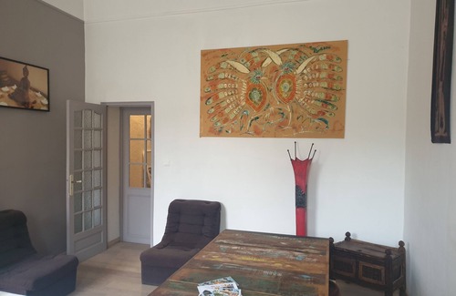 Cosy apartment with kitchen/dining room, comfortable living room with video-projector and large screen, quality speakers with Bluetooth amplifier, wifi, books, board games, African game, massage table, double bed on the mezzanine and bathroom with corner bathtub for 2.