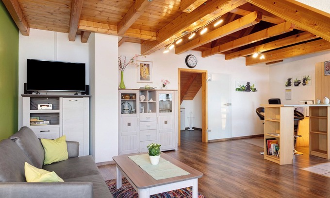 Arrive and feel at home in our quietly located vacation apartment with loft character, in the middle of the fruit and wine village of Königschaffhausen. The apartment is 84 m² in size, is located on the top floor and offers space for 2 people. It has been completely renovated. The bedroom is furnished with a large box-spring bed. In the open living area there is a sofa bed for 2 more people. There is also a dining area and a fully equipped kitchenette in the living area. The bathroom is equipped with a bathtub and shower, separate WC. Bed linen and towels included.
