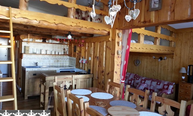 (Text automatically translated) rent beautiful apartment of 60m ² comfortable for 10 people max 12 fully renovated in 2013 everything has been redone nine. it is equipped with two mezzanine with two single bed room double bed room superimpose a large living room with a corner sofa, sleeps 5 plus a convertible sofa 4p convertible also has a dirty kitchen with a large dining table and 10 chairs there Two stool if you were 12 pers.Mobilier Savoy, flooring, paneling, underbody beer, lambrie, flat ecrant 101 cm electric fireplace stunning views of Mont Blanc. Ideally located on the slopes and near the ski commerces.Casiers and shoes inside the apartment near the front door. Liaison inter-station by free shuttle or cab suspended between 2000 and 1950. Paradiski ski area with 425 km of slopes between arcs and La Plagne. Possibility to unload the luggage in front of the north entrance of the residence. Parking nearby indoor or outdoor or free 2 km with return shuttle. To spend a great evening you will have a plancha table service has melted and a raclette