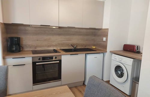 Kitchen (top-mounted fridge, induction hob, oven, washing machine, coffee maker, toaster)