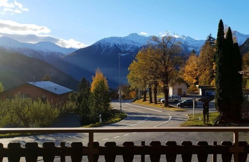 "Gemmi", 2-room apartment 54 m2 on 1st floor, south facing position. Bright, partly in 2025, comfortable and cosy furnishings: open living/dining room 30 m2 with 1 double sofabed (140 cm, length 200 cm), dining table and digital TV. Exit to the terrace. 1 double bedroom with 1 double bed (180 cm, length 200 cm). Open kitchen (3 hot plates, oven, kettle, microwave, freezer, electric coffee machine, raclette grill). Bath/WC. Large terrace 40 m2, south facing position. Terrace furniture, deck chairs. Marvellous panoramic view of the mountains and the countryside. Facilities: Internet (WiFi, free). Parking (1 car). Please note: non-smokers only.