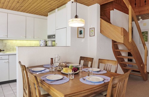 "Heidi", 4-room maisonette 120 m2 on 2 levels, on the top floor, south facing position. Spacious and bright, partly with sloping ceilings, partly renovated in 2023, very comfortable and cosy furnishings: open living room with open-hearth fireplace (only for decoration), dining table, radio and CD-player. Exit to the balcony. 1 room with 1 french bed (160 cm, length 200 cm). 1 small room with 1 bed (120 cm, length 200 cm). Open kitchen (oven, dishwasher, 4 ceramic glass hob hotplates, toaster, kettle, electric coffee machine, Capsules for coffee machine (Nespresso) extra, raclette grill, fondue Set (cheese)). Shower/WC. Upper floor: (steep stair) open gallery with sloping ceilings with cable TV (flat screen). 1 large room with sloping ceilings with 1 french bed (160 cm, length 200 cm), shower/WC. Carpet. South facing position and west facing position. Balcony furniture. Marvellous panoramic view of the mountains and the countryside. Facilities: hair dryer. Internet (WiFi, free). Parking space n 18, height 200 cm. Please note: suitable for families. Non-smokers only, non-smoking house. No lift.