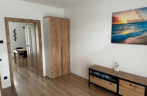 Apartment in Ch opy near Seaside Beach is located in Chłopy, just 24 miles from Kolberg Pier and 24 miles from Kołobrzeg Lighthouse. 22 miles from Town Hall and 23 miles from Kołobrzeg Railway Station, the property features water sports facilities and a garden. Free Wifi is available throughout the property and Sarbinowo Beach is a 10-minute walk away. Featuring a terrace and garden views, the apartment includes 1 bedroom, a living room, cable TV, an equipped kitchen, and 1 bathroom with a shower. The accommodation is non-smoking. Guests at the apartment will be able to enjoy activities in and around Chłopy, like walking tours. A water park is available on-site, and both cycling and fishing can be enjoyed close to Apartment in Ch opy near Seaside Beach. Mielno Koszalińskie Train Station is 4.1 miles from the accommodation, while Friendship Promenade is 4.9 miles from the property. Solidarity Szczecin-Goleniów Airport is 75 miles away.