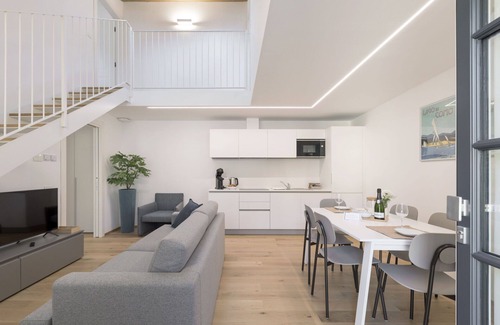 The apartment has a kitchen equipped with an induction hob, refrigerator, dishwasher, microwave, Nespresso coffee machine, and kettle.