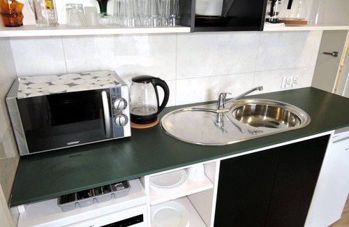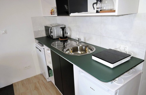 Layout: Ground floor: (Entrance, open kitchen(electric kettle, boiling water tap, toaster, cooker(1 ring stove, induction), coffee machine, espresso machine, dishwasher, fridge-freezer), Living/bed room(double sofa bed, TV(german television channels), dining table), bedroom(single bed, single sofa bed), bathroom(shower, washbasin, toilet)) Garden Furniture , balcony or terrace, garden(shared with other guests, landscaped garden), BBQ(shared with other guests), parking