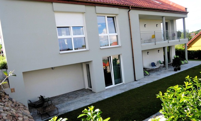 Layout: Ground floor: (Entrance, open kitchen(electric kettle, boiling water tap, toaster, cooker(1 ring stove, induction), coffee machine, espresso machine, dishwasher, fridge-freezer), Living/bed room(double sofa bed, TV(german television channels), dining table), bedroom(single bed, single sofa bed), bathroom(shower, washbasin, toilet)) Garden Furniture , balcony or terrace, garden(shared with other guests, landscaped garden), BBQ(shared with other guests), parking