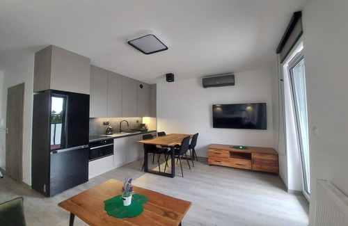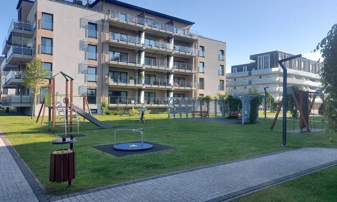 Modern apartment complex close to the seaside beach. Comfortable 2-room apartments on the first floor (there is a lift). Each has a large balcony. The apartment consists of a living room (table, TV, 2-person sofa bed), kitchen, 2-person bedroom and bathroom with shower (there is a washing machine). Central heating, air conditioning. Wireless internet is available. An attractive playground awaits you on the premises of the holiday complex. There is also an "open-air" gym. There is parking. The price of your stay includes: bed linen, water consumption, heating, air conditioning, internet, cot, parking. Sianożęty is a small holiday resort located approx. 10 km from Kołobrzeg, in the immediate vicinity of another seaside resort - Ustronie Morskie. Sianożęty is located right next to a wide, sandy beach. Golden sand and a gentle descent to the sea encourage holidaymakers to sunbathe and swim in the sea. In the neighbouring Ustronie Morskie there is also a 100-metre long walking pier. Sianożęty is a quiet summer resort where you can count on real relaxation. The international R-10 cycling route runs through here. It runs along the coast and provides amazing views of both the beaches, the clean sea and the charming peat bogs. By bike, you can easily and pleasantly get from here to the nearby Ustronie Morskie, but also to the large Kołobrzeg.