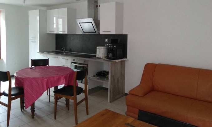 On the 1st floor of a village house in the center of the village, you will find an equipped kitchen (dishwasher, microwave, hotplates, oven, fridge, freezer, coffee maker), with a living-dining room with TV. .