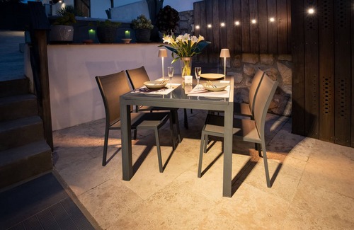 This vacation rental features a private outdoor area with a whirlpool and garden.