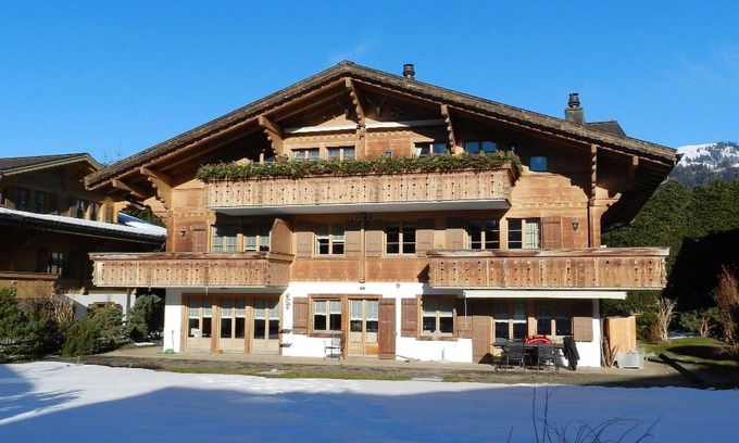 80 m2. More information by the provider: 3 room apartment (80sqm) on the 1st floor of a multi-family chalet in Gstaad built in 2003. 5 minutes walking distance to the centre and the train station. Calm location, sunny and with partial view to the mount Oldenhorn. Close to the ski and cross-country ski runs. Ideal starting point for hiking tours. 1 large balcony with garden furniture. 1 garage and 1 opened parking as well as a laundry with washing machine and tumble dryer for common use are available.