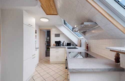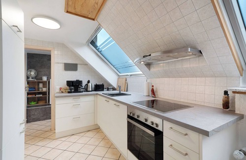 The 90sqm maisonette vacation apartment has two bedrooms and is therefore suitable for up to 4 people - ideal for families. The two bedrooms are located in the upper part of the apartment; the staircase leads to the first bedroom (children's room with sofa bed and a single bed as well as a TV), which is also connected to the apartment's balcony. If you go through the first bedroom, you will find the second bedroom with a double bed directly behind it. Also on the upper floor is the bathroom with washbasin and shower, as well as a separate WC. The fully equipped kitchen (with fridge, ceramic hob, oven, dishwasher, microwave, coffee machine, kettle, toaster, egg stove and a full set of crockery and pots) as well as the living room with large couch and TV and another separate WC can be found on the lower floor of the maisonette apartment. In front of the kitchen is the beautiful dining table, which offers plenty of space for cozy get-togethers. Please note that the apartment can be reached from the outside via 2 flights of stairs. Bed linen, towels and kitchen linen are provided. WLAN access is also available free of charge. A (small) dog can be brought along on request (for a one-off fee of EUR 30.00).