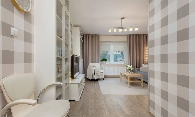 A stylish and bright interior with a unique location full of greenery is a special feature of the Warsaw apartment. This delightful apartment can accommodate up to 4 people, so the whole family or a group of friends can stay here. The beautifully decorated, functional living space consists of a spacious living room, a well-equipped kitchenette, a bedroom and a bathroom with shower and separate toilet. The rooms are flooded with natural light, creating a positive atmosphere. A separate bedroom offers guests the ultimate in comfort and privacy. It is furnished with a comfortable sleeping area - two single beds (which can be converted into a double bed) and a spacious wardrobe. The bedroom also has a desk and chair for guests to work or study remotely. The living area has a sofa bed and a Smart TV with cable channels - the perfect place to unwind after a busy day. Whether the interior is fully furnished, immaculately decorated or stylishly accentuated to reflect the location of the apartment, it is an exceptional refuge from the hustle and bustle of the city. A muted palette of beige tones underlines the unique and carefree atmosphere of this place. Multimedia is guaranteed in the apartment with a flat screen TV and Wifi Internet. White goods - oven, microwave, dishwasher, coffee maker, toaster, blender or food processor - make the apartment self-sufficient for all daily needs. A complimentary set of toiletries, towels and bed linen are provided to ensure a good start to each arrival. The property is equipped with everything you need for rest and relaxation. The bright and sunny interior has been carefully decorated to satisfy the guest's aesthetic sense. The bedroom has a continental bed that can be extended into two single 90x200 beds.