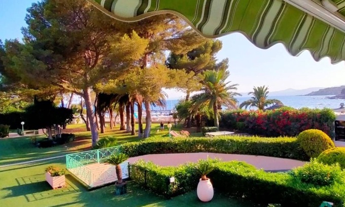 Apartment 'feet in the water' direct access to the sea, in small residence (24 apartments) with caretaker on the spot, first floor apartment, fully renovated, air-conditioned, with balcony sea view and park, 1 double bedroom, living room / bedroom 1 sofa bed 2 places, kitchenette (Microwave, Dishwasher, fridge-freezer, plates), shower, WC, TV flat screens, park view, sea, secured pool, small port (40 bat). Park of 6000 m², with swimming pool, 2 deckchairs / apartment, deckchairs available under the palm trees by the sea, underground parking with dedicated place.