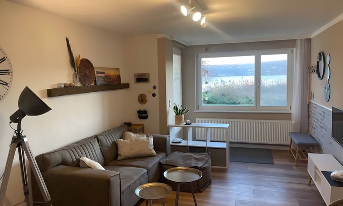 Overlooking Lake Constance, the holiday apartment Seezauber direkt am Wasser with step-free access and interior in Reichenau impresses guests with its fantastic views. The 50 m² property consists of a living room, a well-equipped kitchen, 1 bedroom and 1 bathroom as well as an additional toilet and can therefore accommodate 2 people. Additional amenities include Wi-Fi (suitable for video calls) as well as a smart TV with streaming services. In addition, a shared sauna is available for your use. A baby cot and a high chair are also available. This vacation rental offers a private outdoor space with a garden and a covered terrace.
