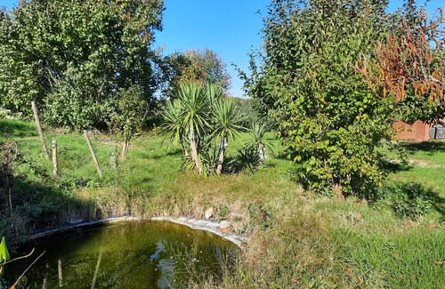 The largest room is the bedroom with a double bed, two shelves, a folding table with two chairs, a TV with satellite reception and a view of the house's garden.