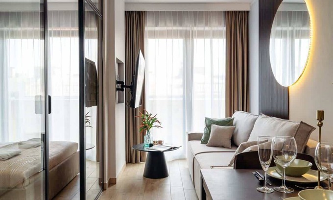 The apartment consists of a cozy bedroom with a comfortable 2-person bed and a living room, where you will find a comfortable sofa bed with sleeping function for 2 people. In the living room you will also find a table with chairs, which is perfect for shared meals. The open and fully equipped kitchen will allow you to prepare your favorite meals at any time. The bathroom is also fully equipped and furnished, ensuring your comfort during your stay.