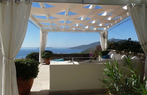 Modern and spacious, "Safir" is a two-storey apartment, one of four with a shared pool, beautifully maintained gardens and pergola. Absolutely stunning views of sea and mountain, only 10 minute walk to Kalkan centre. Direct access to infinity pool, private BBQ area and patio downstairs. Upstairs balcony leading off both bedrooms. It is pleasant 10 minute walk down to the lively Kalkan town centre.