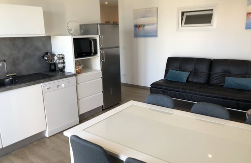- living room with sea view, equipped with a TV, a sofa bed and an equipped kitchen (fridge, dishwasher, induction hob, microwave, coffee maker, kettle, toaster and dishes).