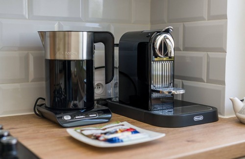 The kitchen is equipped with a dishwasher, a coffee maker, and cookware.