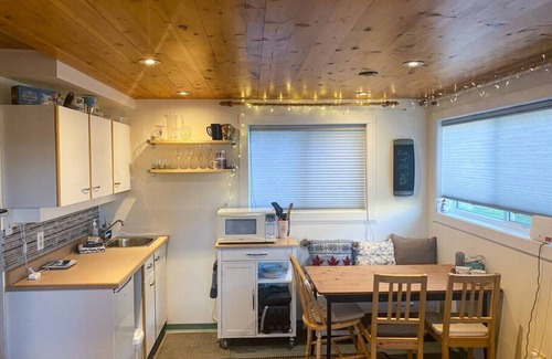 The open concept kitchenette and dining room has everything you need to enjoy your stay with lighting to add all the cozy romantic ambience.