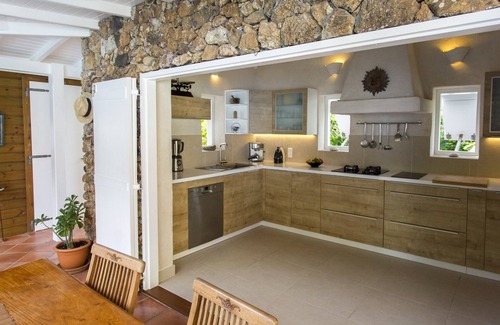 The Caribbean-style villa Apiano is built on typical architecture with several bungalows and bright colours around a central terrace. The decor is warm and furnished with carved and sculpted wooden furniture. The comfortable living room welcomes guests around a majestic grand piano that music lovers will marvel at. Sofas, armchairs, cushions and silky fabrics dress this very cozy space coming with wainscotted walls. The terracotta-coloured tile floor brings a pleasant feeling of comfort. The kitchen is large and spacious, with all the necessary equipment to prepare delicious meals to be enjoyed around the large rectangular wooden table for eight guests under the covered terrace, that you can access through a large opening from the living room.