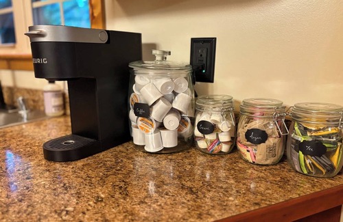 This cabin has a Keurig coffee maker and K Cups are provided.