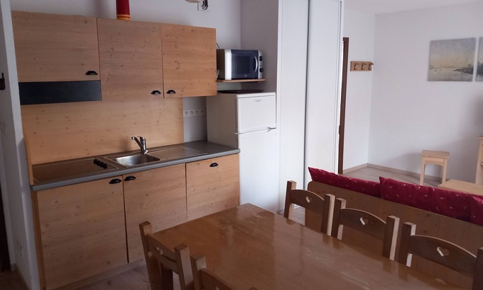 2 room apartment of 50m² for 8 people with a balcony North East on the 1st floor without elevator. The balcony overlooks the upstream slope. It consists of: A room with 1 bed 2 persons 140 and a pull-out sofa for 2 people. A mountain corner with 2 bunk beds (separated by a curtain). A living room with a pull-out sofa for 2 people, TV. A kitchen area equipped with 4 ceramic hobs, a fridge / freezer, a combination microwave and a dishwasher. A bathroom with bathtub and separate WC. Parking at the foot of the residence. Ski locker. The beds are equipped with duvets.