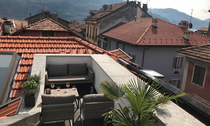 The rooftop terrace, overlooking the church and the rooftops of Cannobio, provides a sheltered, private outdoor area with garden furniture and electric grill.