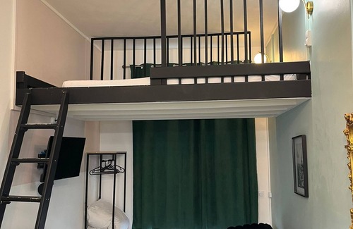 Comfortable double bed located on the upper mezzanine level, accessible by ladder. The space is bright and airy, thanks to luminous windows and dedicated lighting at the top level.