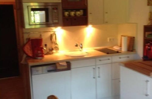 Comfortable, small holiday home with a fenced garden. (Double house), not visible with large wooden terrace and a view of nature. 2 persons. . Also with a dog. Absolute calm and the hiking trails start from the house. Living area with integrated kitchen. Bedroom with a double bed 180x200. TV. Second small living room with a pull -out couch. Small but very fine shower bath. TV, stereo system, books available and much more large wooden terrace. The kitchen is fully furnished with dishwasher, microwave with grill, ceramic hob, pretty dishes and much more. There is a grill in the garden, a nice seating area (teak) and sun loungers and parasol.
