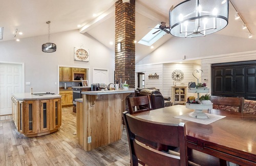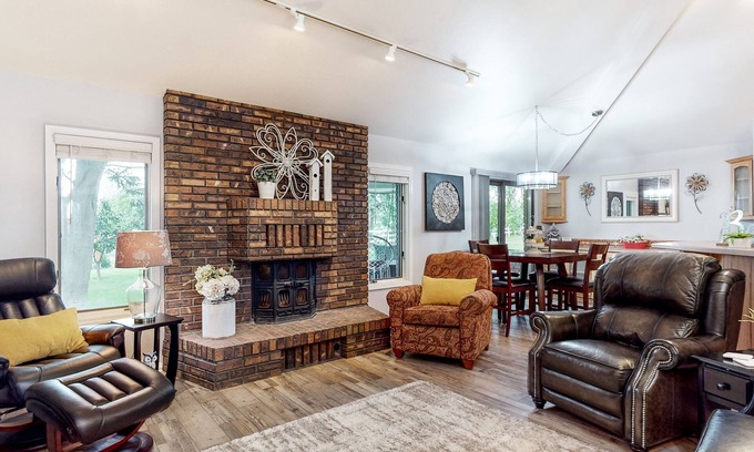 Welcome to Apple Cottage, your serene escape nestled in a working farm and apple orchard just minutes from Twin Falls, ID. This newly renovated cottage offers a delightful blend of comfort and charm, featuring three spacious bedrooms and two full bathrooms, perfect for a romantic getaway or a family retreat. The bright and airy open-concept great room is accentuated by a cozy brick wood-burning fireplace, creating an inviting atmosphere for relaxation.